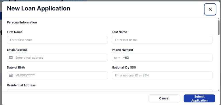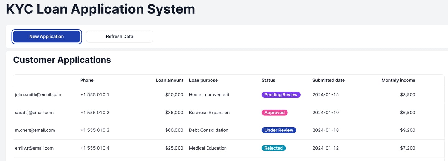 I designed and developed a no-code KYC (Know Your Customer) loan application system to streamline how bank customers apply for loans online. The solution enables customers to register, enter their basic personal information, and submit all required loan application details—including loan amount, loan purpose, monthly income, and supporting identification data. Once submitted, each application is automatically added to the bank’s internal loan application management dashboard, where admins can view the status, date submitted, and all customer-provided information in a structured format.